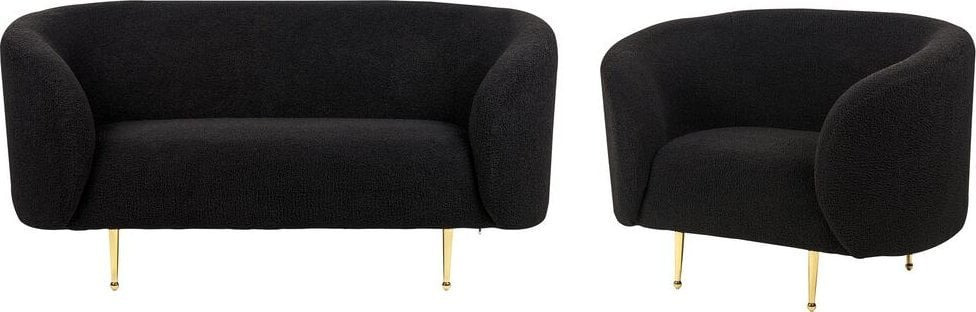Šis gražus sofų komplektas dvelkia prabanga – nuo auksinių kojelių iki švelnių apmušalų linkių. Padengtas tekstūruotu bukle audiniu, jis atrodo ir yra minkštas bei patogus, suteikiantis erdvei jaukumo. Stori, paminkštinti atlošai užtikrina patogų sėdėjimą, todėl šis komplektas puikiai tiks skaityti ar žiūrėti televizorių vėlai vakare. Elegantiškas sofos ir fotelio dizainas puikiai papildys eklektiško, tradicinio ar vidurio amžiaus stiliaus interjerą.