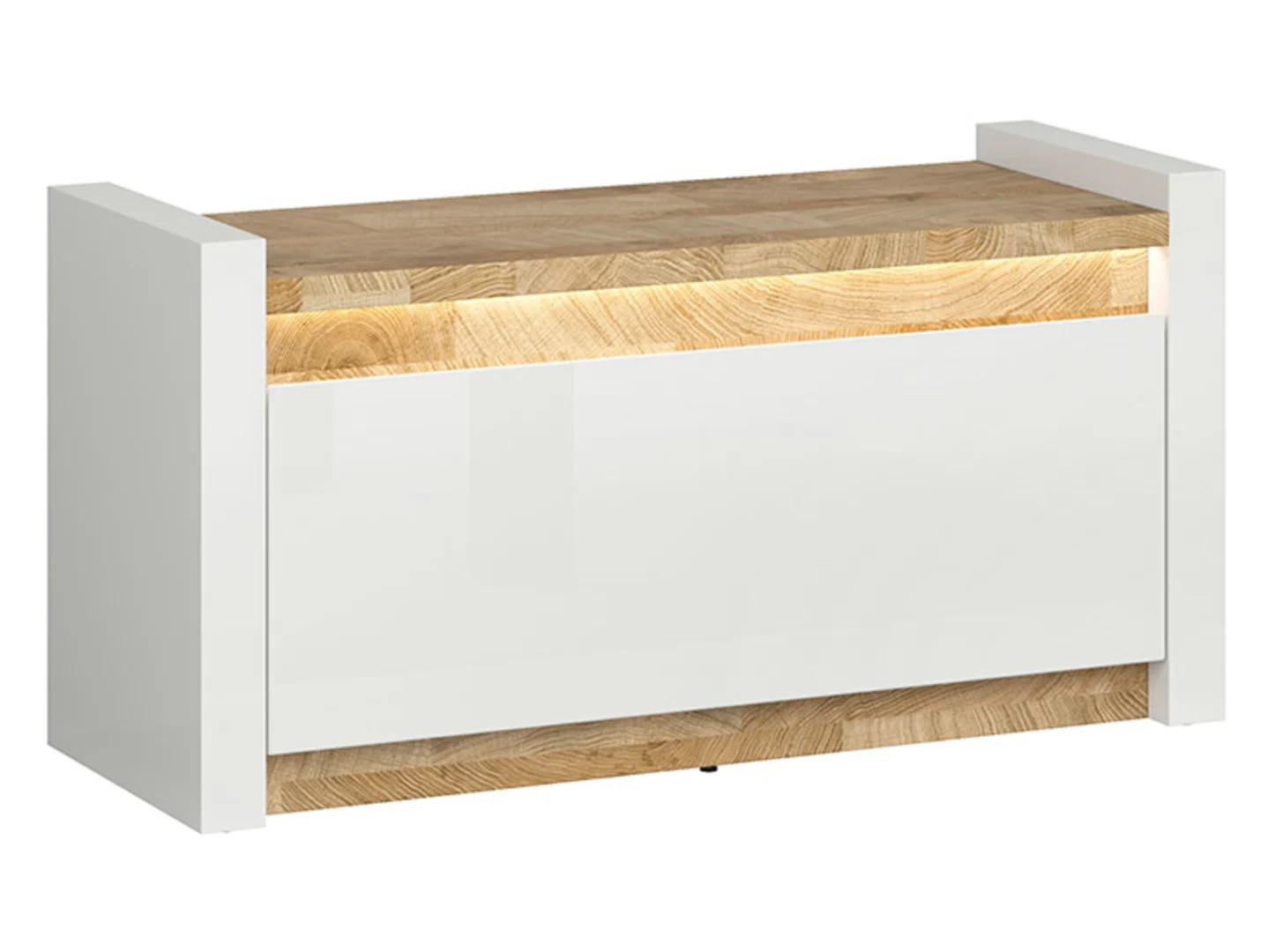 Baltas blizgus korpusas derinamas su baltomis blizgančiomis fasadomis. Šis ryškus duetas derinamas su darbo stalviršiu ir cokoliu, padengtu Westminster ąžuolo dažais, kurie atskleidžia natūralios medžio tekstūros grožį ir faktūrą.