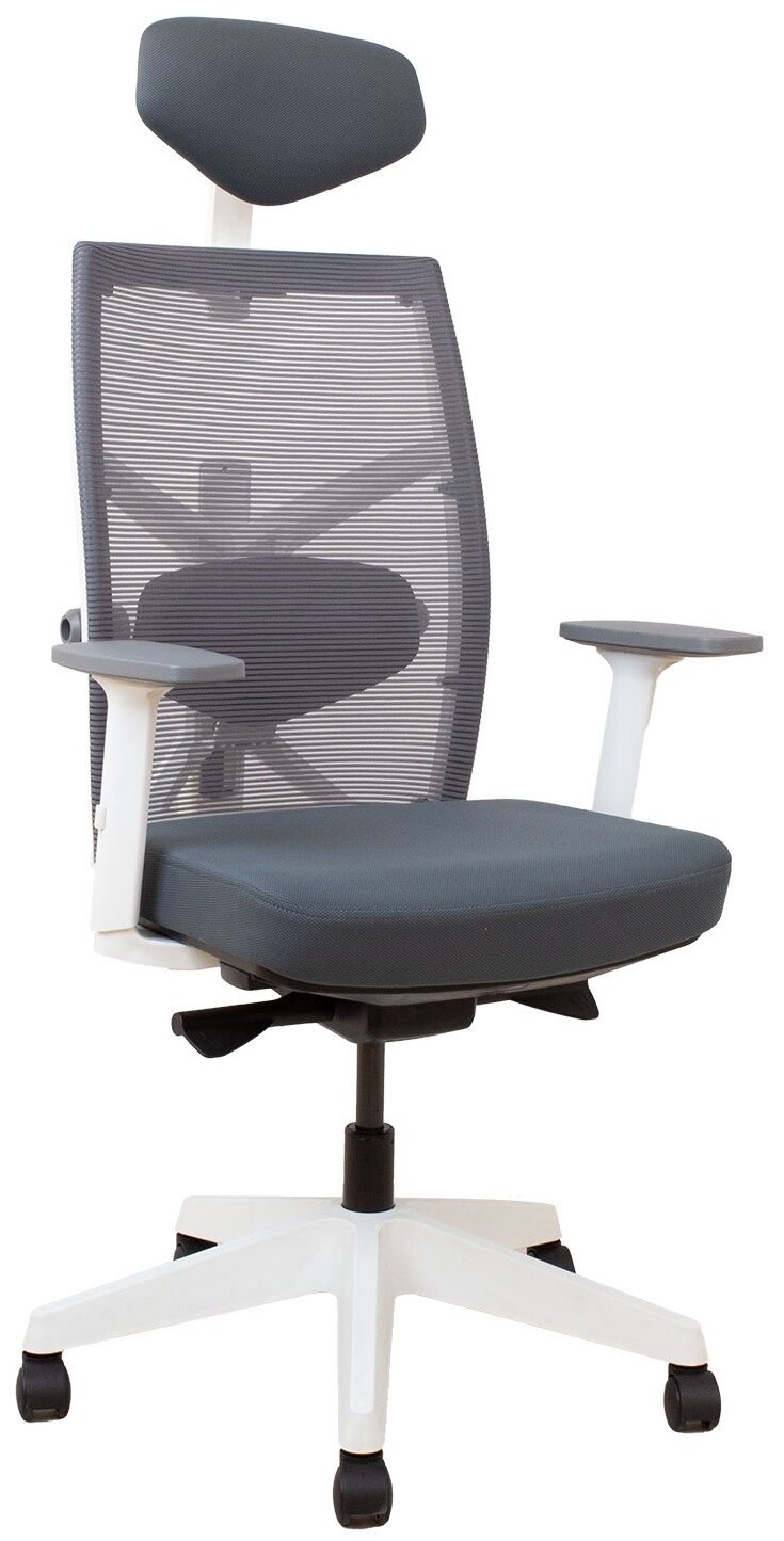 Darbo kėdė TUNE pilka su baltu rėmu Darbo kėdė TUNE pilka su baltu atlošo rėmu. Sėdynė aptraukta poliesterio audiniu, 50 000 Martindale's. Atlošas aptrauktas poliesterio tinkleliu. Baltas spalvos plastikinis išorinis rėmas. Kėdė turi supimo mechanizmą, automatinį supimo įtempimo reguliavimą ir fiksavimo funkciją. Pneumatinis sėdynės aukščio reguliavimas. Atlošo aukščio reguliavimas 50-60,5 cm. Reguliuojama juosmens atrama. Reguliuojamas sėdynės gylis 44-48 cm. Porankiai pagaminti iš balto ir pilko plastiko. Porankių gylis ir kampas reguliuojami, aukštis reguliuojamas 20,5-30,5 cm. Laisvai pasilenkianti galvos atrama 30°, reguliuojamas aukštis. 5 krypčių plastikinė bazė, D70 cm. Kėdė turi automatinius stabdžius ratukus, 65 mm. Bendri kėdės matmenys 70x70xH111-128 cm. Kėdės aukštis 111-128 cm, sėdynės aukštis 41,5-51,5 cm, sėdynės gylis 44-48 cm, sėdynės plotis 49 cm. Svorio apribojimas 120 kg.