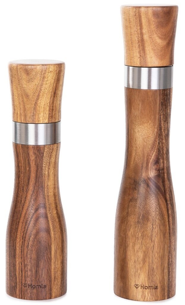 HOMLA MOOKA pipirų ir druskos malūnėliai išsiskiria stilingu mediniu korpusu. Funkcionalūs, patikimi, su praktiška rankenėle, leidžiančia greitai nustatyti malimo storį. Du dydžiai leidžia lengvai atskirti, kokiais prieskoniais užpildytas malūnėlis.