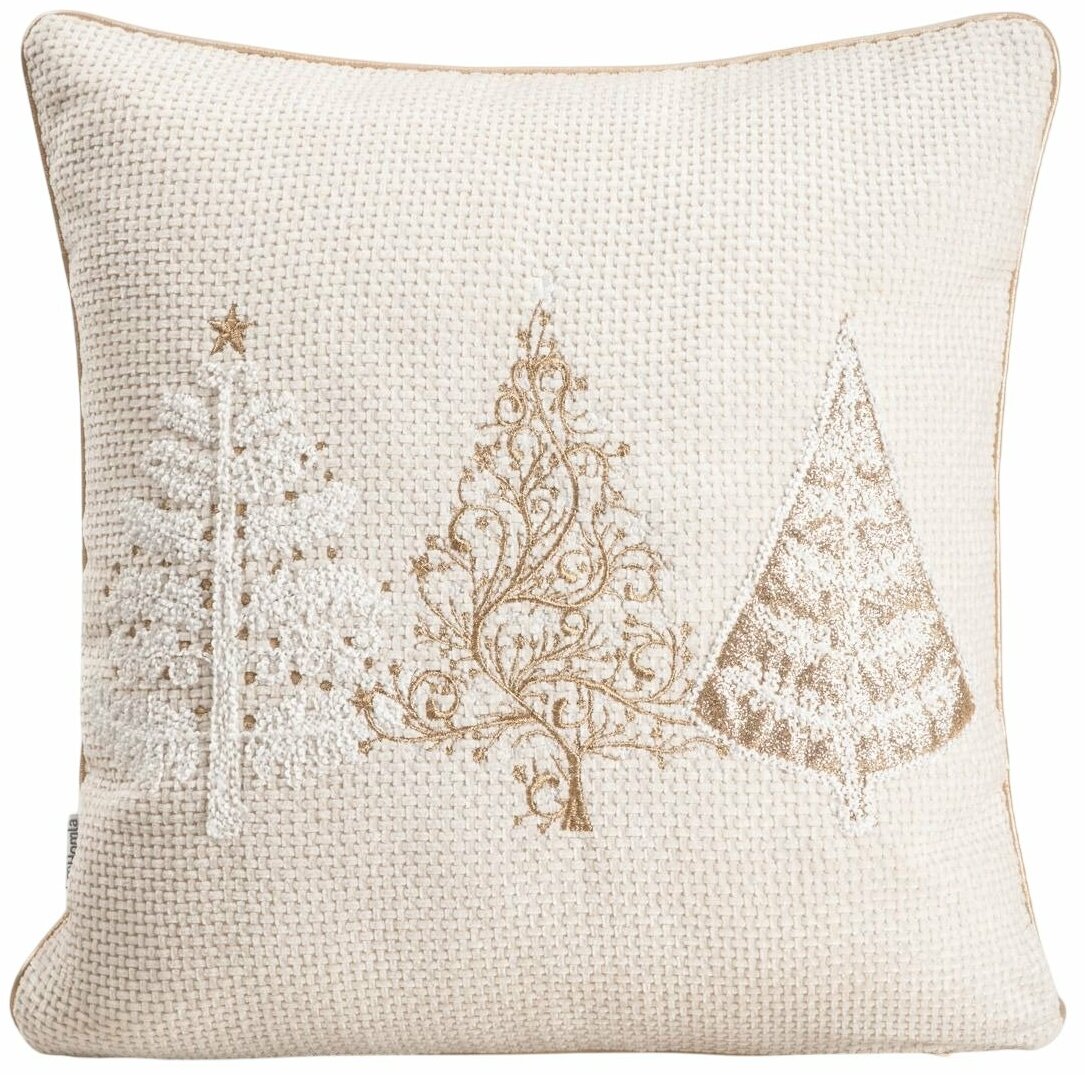 Smėlio spalvos dekoratyvinė Kalėdų pagalvėlė su auksinėmis Kalėdų eglutėmis