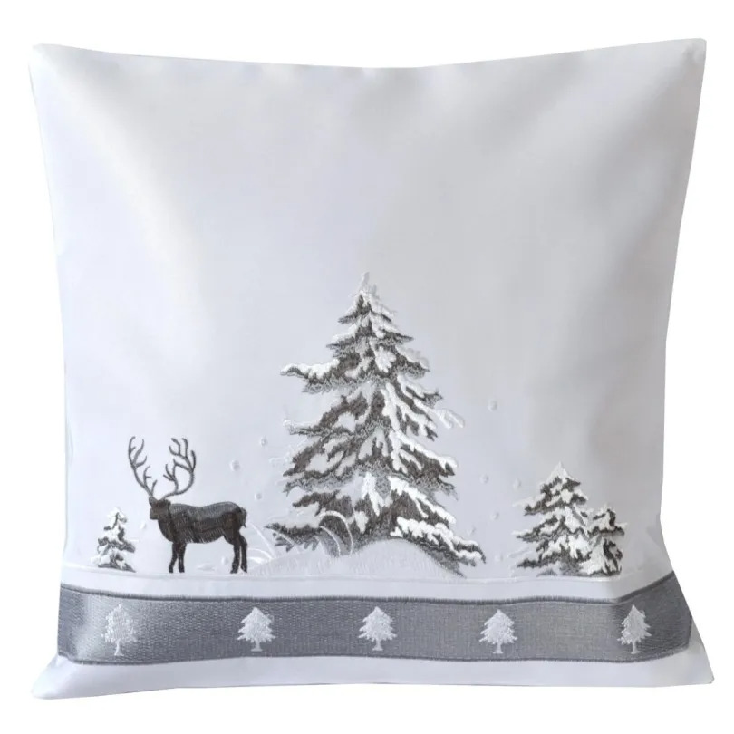 Ši elegantiška dekoratyvinė pagalvės užvalkalas pagamintas iš aukštos kokybės poliesterio, puikiai sustiprinantis bet kurio interjero šventinę atmosferą. Siuvinėjimas, vaizduojantis žiemos peizažą su snieguotomis Kalėdų eglutėmis ir elnio siluetu, išsidėstęs baltame fone, suteikia visam kūriniui subtilų, žiemišką charakterį. Dekoratyvinė juostelė pagalvės užvalkalo apačioje, papuošta subtiliu sidabriniu Kalėdų eglutės motyvu, suteikia papildomo akcento. Lygus audinys yra švelnus liesti, lengvai prižiūrimas ir nesiglamžo, todėl šis pagalvės užvalkalas yra ne tik gražus, bet ir praktiškas kasdieniam naudojimui. Puikiai tinka kaip svetainės ar miegamojo dekoracija arba kaip šventinė dovana. Atminkite, kad spalvos gali skirtis priklausomai nuo jūsų monitoriaus nustatymų. Skalbimo instrukcijos yra etiketėje. Matmenų paklaida +/- 5%.