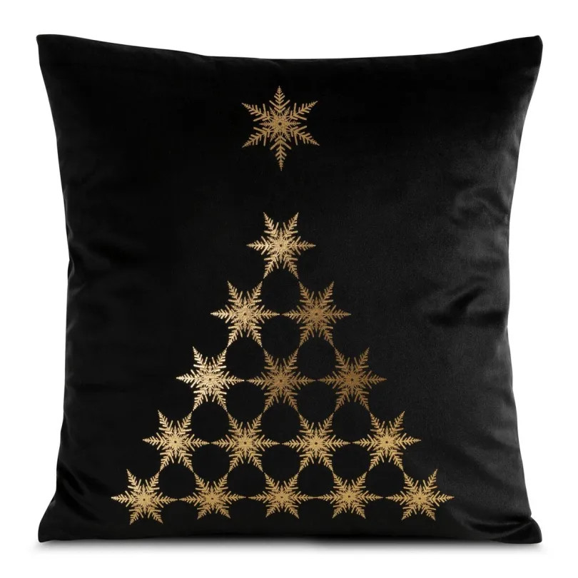 Juoda aksominė pagalvė su aukso spalvos Kalėdų eglutės motyvu, pagamintu iš snaigių. Blizgantis auksinis atspaudas puikiai kontrastuoja su giliai juoda audinio spalva, sukurdamas elegantišką šventinį akcentą, kuris puikiai tiks Kalėdų interjero dekoravimui. Atkreipkite dėmesį, kad spalvos gali skirtis priklausomai nuo monitoriaus nustatymų. Plovimo instrukcijos pateiktos etiketėje. Matmenų tolerancija +/- 5%.