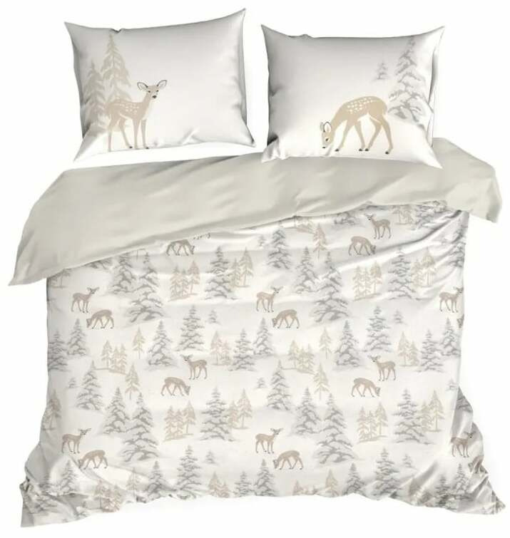 Subtilūs medvilniniai patalynės užvalkalai su žavingu elnių ir Kalėdų eglučių raštu, pastelinėmis smėlio ir pilkos spalvų atspalviais šviesiame fone. Švelnus žiemos peizažas suteikia miegamajam ramybės ir natūralaus žavesio. Apatinė pusė – šviesiai smėlio spalvos. Minkštas, laidus orui audinys ir praktiški užtrauktukai daro šį rinkinį idealų kasdieniam naudojimui tiek suaugusiems, tiek vaikams. Atkreipkite dėmesį, kad spalvos gali skirtis priklausomai nuo monitoriaus nustatymų. Skalbimo instrukcijos nurodytos etiketėje. Matmenų nuokrypis +/- 5%.