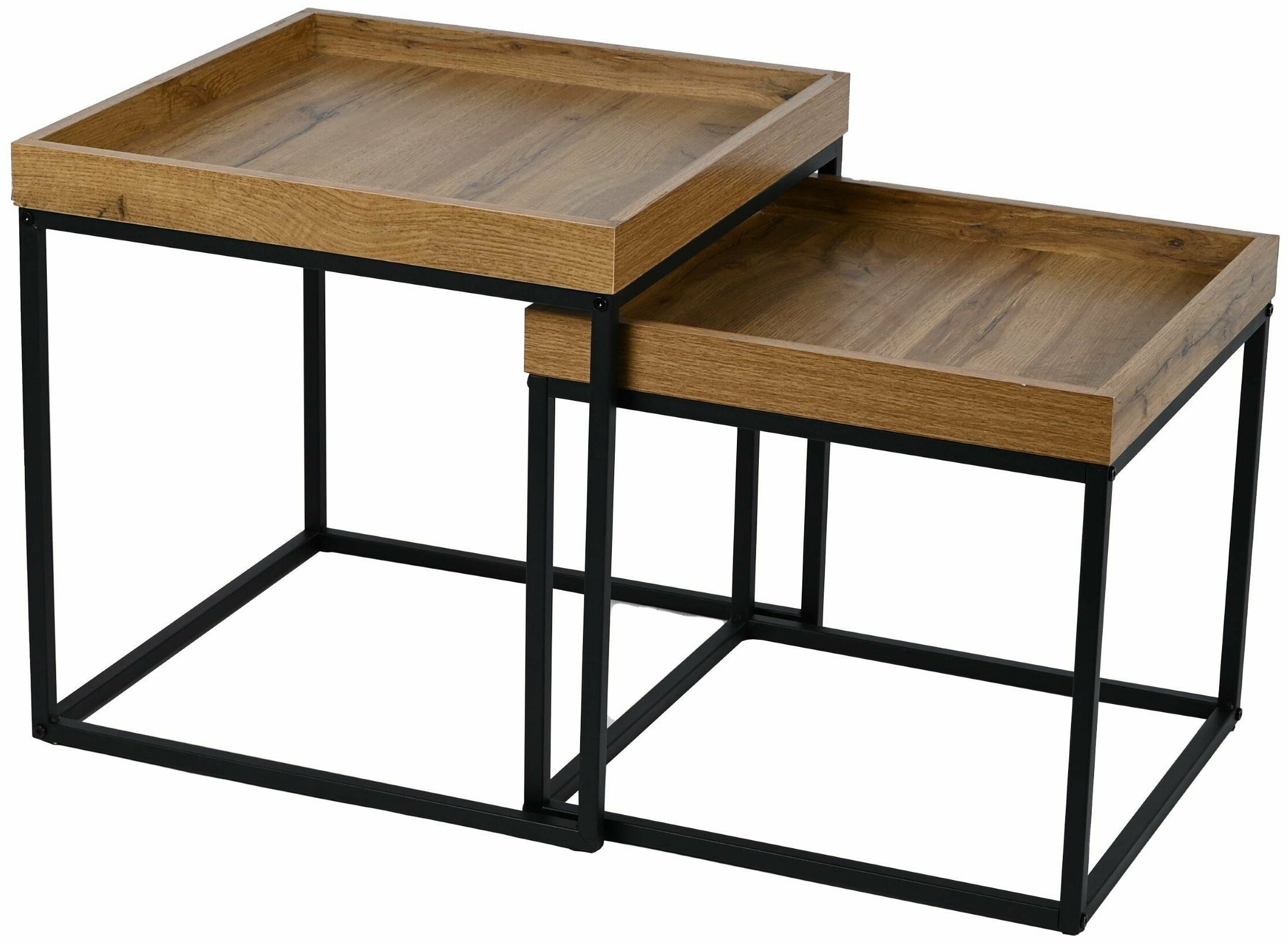 Šis modernus dviejų dalių įdedamų staliukų rinkinys pasižymi tvirtu ir stabiliu plieniniu rėmu su milteliniu būdu dengta apdaila. Staliukų stalviršiai yra ąžuolo spalvos, pagaminti iš MDF plokštės, maždaug 15 mm storio.