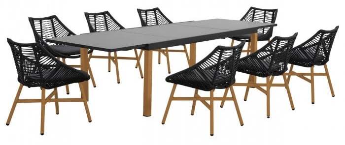 Praktiški aliuminio baldaiAliuminio rėmas suteikia baldams tvirtumo ir aukštą atsparumą korozijai. Kėdės aptrauktos poliratanu, kuris suteikia joms natūralią, malonią išvaizdą. Be to, kėdžių sėdynės aprūpintos patogiomis pagalvėlėmis, kurios garantuoja komfortą ilgai sėdint prie stalo. Komplekto centrinis elementas – įspūdingas ištraukiamas stalas, prie kurio patogiai telpa 8 žmonės. Stalo stalviršis pagamintas iš grūdinto stiklo, kuris suteikia jam modernumo ir elegancijos.