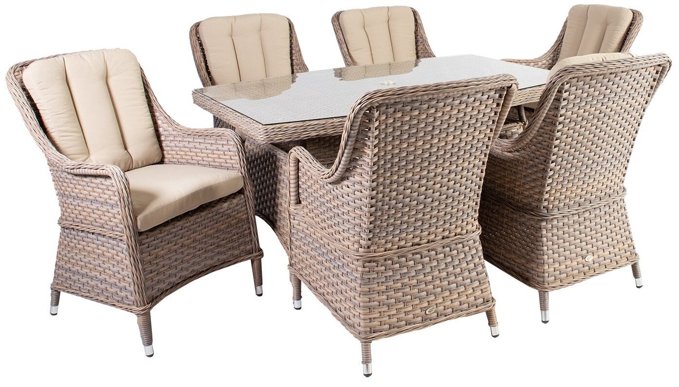Stalo matmenys yra 150 x 100 x 74 cm. Stalo rėmas pagamintas iš aliuminio ir padengtas plastikiniu tinkleliu. Stalviršis: 5 mm pločio grūdintas skaidrus stiklas. Kėdės matmenys: 59 x 73 x 95 cm. Kėdės rėmas pagamintas iš aliuminio ir padengtas plastikiniu tinkleliu. Pridedamos pagalvės. Gaminys yra patvarus kintančiomis oro sąlygomis ir labai lengvai prižiūrimas. Pagalvėlių užvalkalai pagaminti iš oro sąlygoms atsparaus olefino audinio, tačiau drėgmės perteklius vis tiek gali pažeisti pagalvėles ir sukelti pelėsį. Geras sprendimas kasdieniam pagalvių laikymui ir sausam saugojimui yra pagalvių dėžė. Norintiems prailginti lauko baldų tarnavimo laiką, rekomenduojame naudoti lauko baldų užvalkalus. LAIKYMAS: pasibaigus vasaros sezonui rekomenduojame sodo baldus laikyti patalpoje. Prieš laikydami baldus išvalykite ir išdžiovinkite. Laikykite vėsioje, sausoje, gerai vėdinamoje patalpoje.