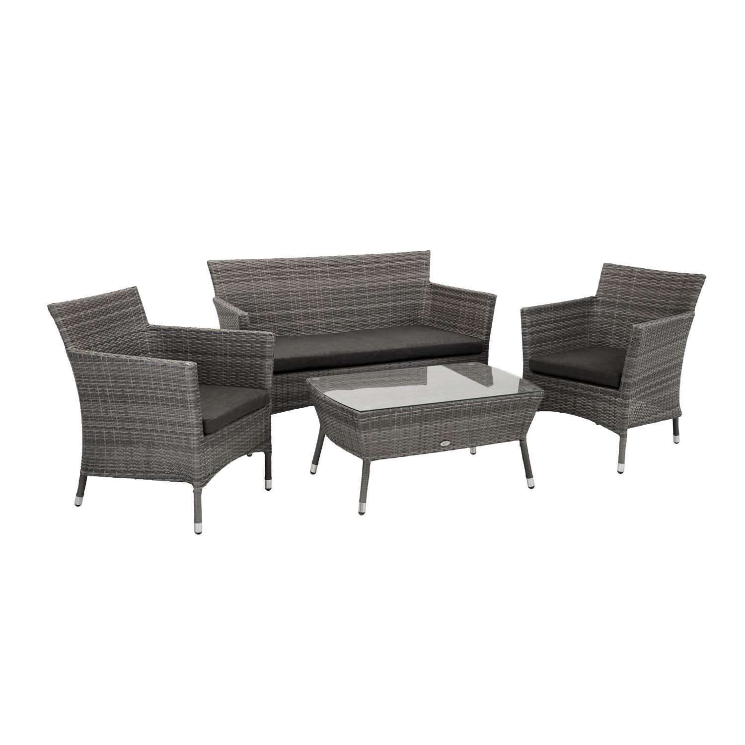 Sodo baldų komplektas: Stalas, Sofa ir 2 krėslai. Pagalvės įtrauktos į komplektą. Pagalvėlių užvalkalai: pilkas olefino audinys. Stalviršis: skaidrus stiklas 5 mm.