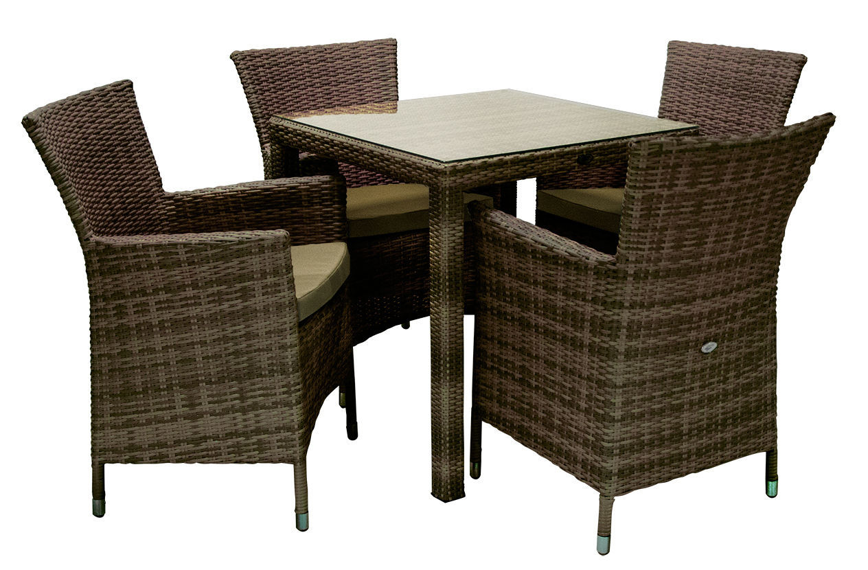 WICKER sodo baldų komplektą sudaro stalas ir keturios kėdės tamsiai rudos spalvos.