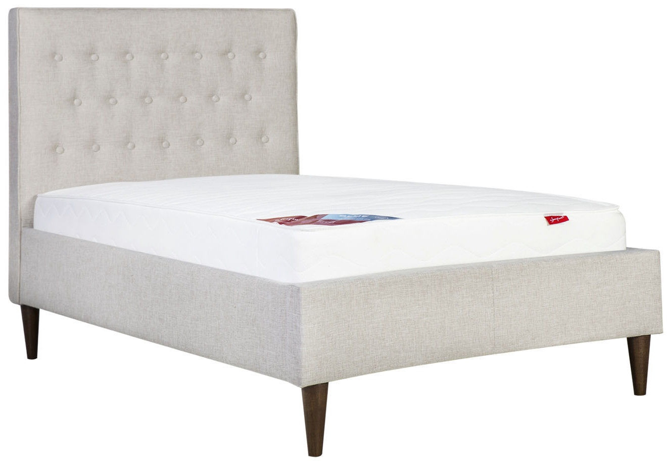 Lova EMILIA 160x200cm, su čiužiniu HARMONY DUO SEASON, smėlio spalvos. IDEALUS MIEGAS PO HOME4YOU. Lovos rėmas pagamintas iš MDF plokštės ir padengtas poliesterio audiniu. Lova turi masyvaus medžio kojas, kapučino spalvos. Komplekte yra galvūgalis, lovos pagrindo lentynos ir spyruoklinis čiužinys HARMONY DUO SEASON. Lovos bendri matmenys yra 166,5x219xH105cm. Spyruoklinis čiužinys HARMONY DUO SEASON 160x200xH29cm.