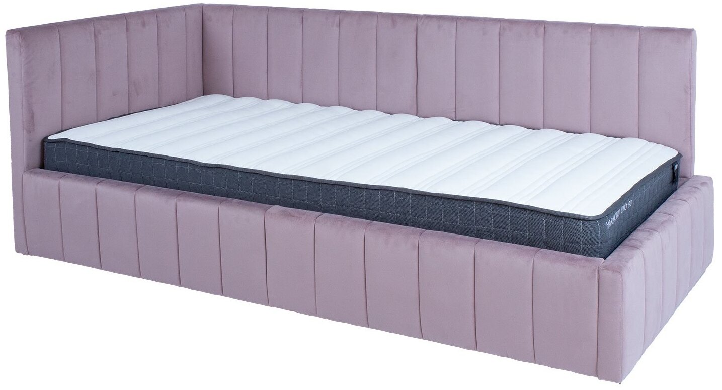 JASPER lova, kurios matmenys 90x200 cm, komplektuojama su HARMONY UNO čiužiniu ir yra violetinės-rožinės spalvų schemos.