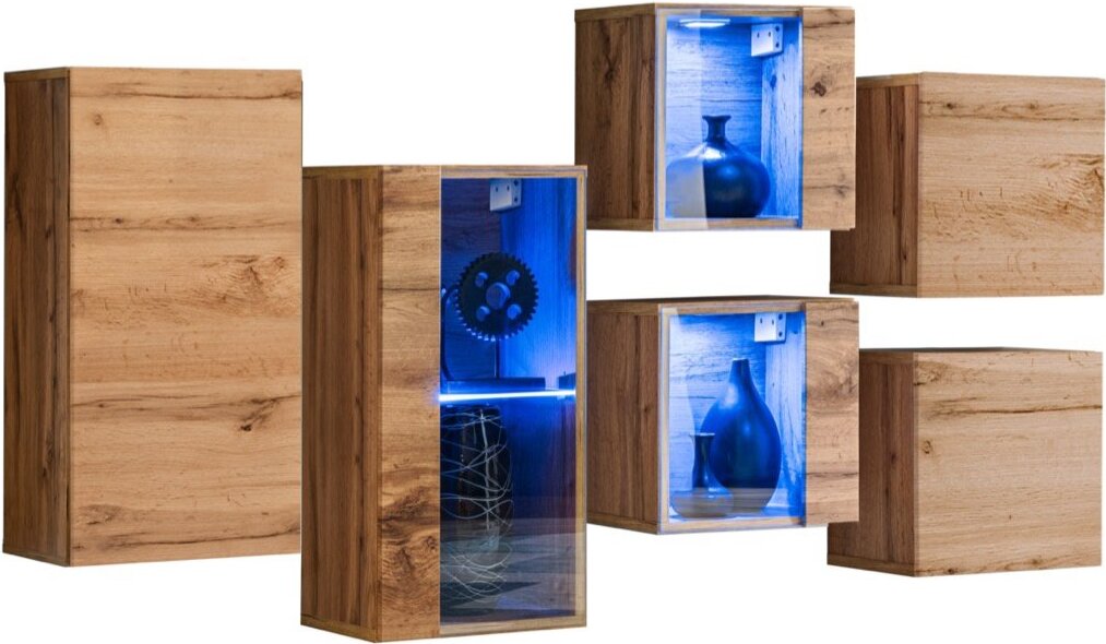 Vitrina: 30 x 60 x 25 cm; Sieninė spinta: 30 x 60 x 25 cm; 2 vitrinos: 30 x 30 x 25 cm; 2 pakabinamos spintelės: 30 x 30 x 25 cm