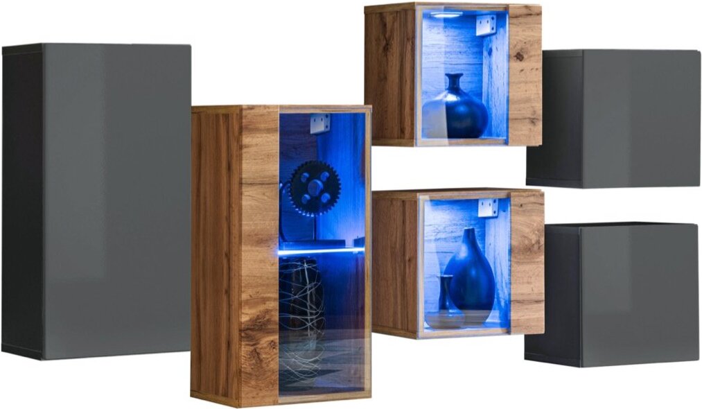 Vitrina: 30 x 60 x 25 cm; Sieninė spinta: 30 x 60 x 25 cm; 2 vitrinos: 30 x 30 x 25 cm; 2 pakabinamos spintelės: 30 x 30 x 25 cm