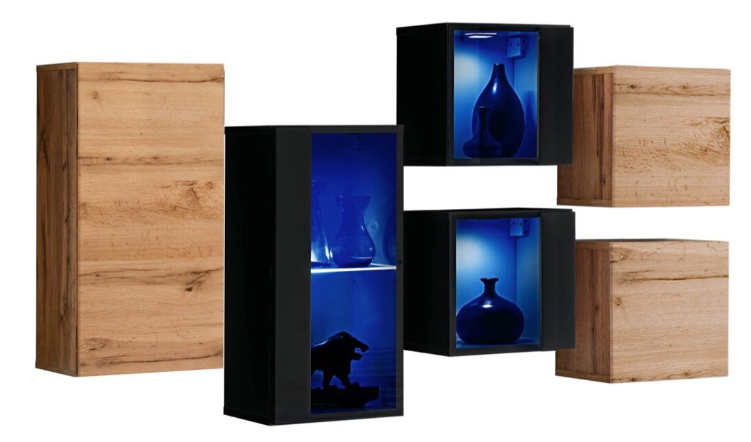 Vitrina: 30 x 60 x 25 cm; Sieninė spinta: 30 x 60 x 25 cm; 2 vitrinos: 30 x 30 x 25 cm; 2 pakabinamos spintelės: 30 x 30 x 25 cm