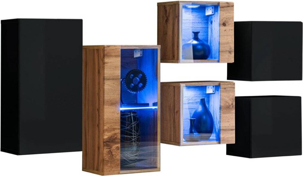 Vitrina: 30 x 60 x 25 cm; Sieninė spinta: 30 x 60 x 25 cm; 2 vitrinos: 30 x 30 x 25 cm; 2 pakabinamos spintelės: 30 x 30 x 25 cm