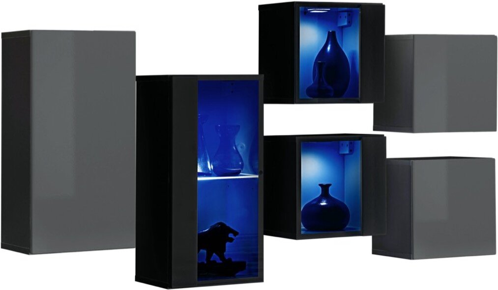 Vitrina: 30 x 60 x 25 cm; Sieninė spinta: 30 x 60 x 25 cm; 2 vitrinos: 30 x 30 x 25 cm; 2 pakabinamos spintelės: 30 x 30 x 25 cm
