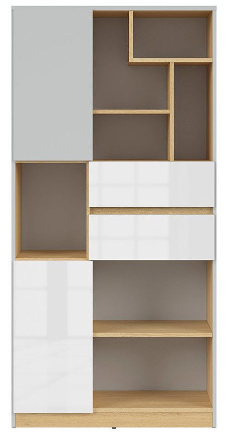 - Korpusas derinamas šviesiai pilkos / lenkiškos ąžuolo (vidus ir lentynos). Šis santūrus derinys yra stilingas rėmas fasadams balta blizgančia danga. Spalvų ir dizainų gerbėjams paruošėme papildomą variantą - stalčiaus fasadą su komiksų arba arabeskos spauda.
