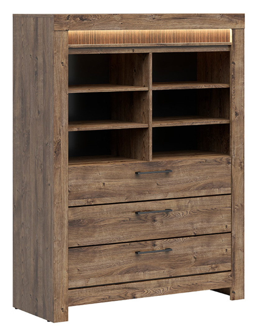 Šaltas ribbeck ąžuolo rudos spalvos atspalvis atspindi medienos natūralios tekstūros grožį. Kieto stiliaus esmė - sustorinti šonai ir metalinės rankenos, bet negalima praleisti išraižytų venge magic ąžuolo lamelių . Tinkamą apšvietimą užtikrina energiją taupanti LED apšvietimo sistema.