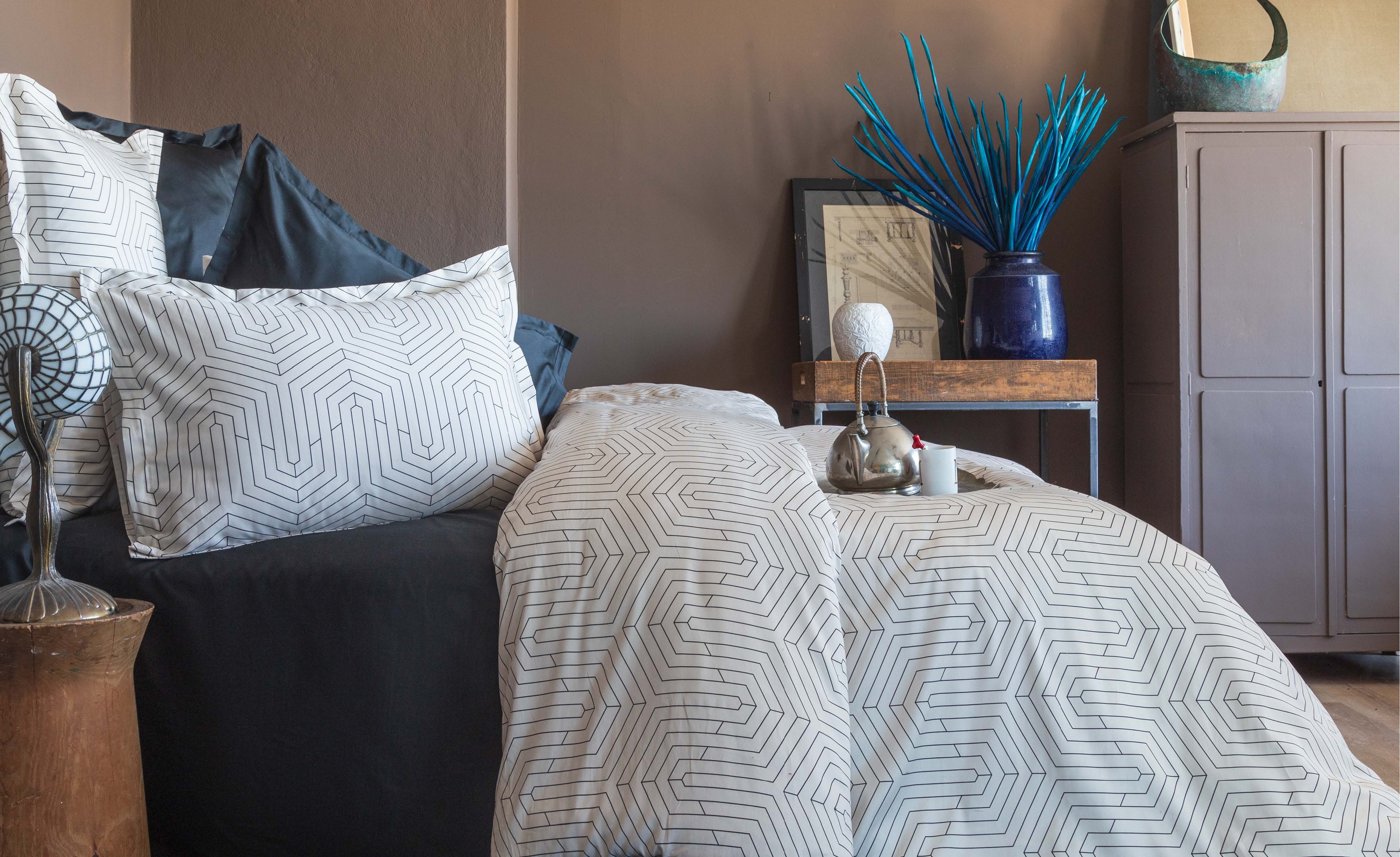 Užvalkalų komplektą sudaro du pagalvių užvalkalai (50x70 cm) ir vienas antklodės užvalkalas (plotis – 200 cm, ilgis – 220 cm ). Komplekto audinys išsiskiria abstrakčiais geometriniais raštais. Plonos linijos sukuria dinamišką vizualinį efektą, kuris traukia akį, miegamojo erdvei suteikia elegancijos. Šis komplektas taps neatsiejama miegamojo dalimi, padės sukurti jaukią, estetišką aplinką.