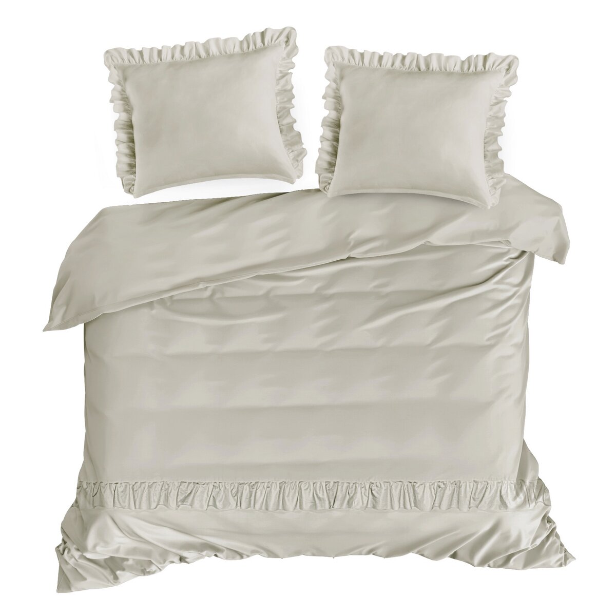 Bedding made of high-quality macosatin. Extremely soft and smooth to the touch. The top side of the bedding and the edges of the pillowcases are decorated with a decorative ruffle. Modern and durable dyeing technology means that the bedding does not lose its color. The set has zippers. This is a perfect option for your own bedroom. Perfect as an elegant and tasteful gift!