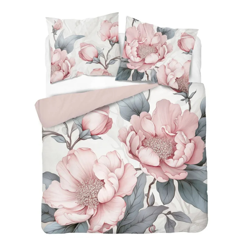 Satininio mikropluošto patalynės komplektas džiugina gėlių rašto subtilumu ir lengvumu, kuriame pavaizduotos nuostabios, žydinčios bijūnai švelniais pudros rožinės ir prislopintos žalios spalvos atspalviais. Gėlės pavaizduotos išskirtiniu dėmesiu detalėms – minkšti toniniai perėjimai ir animacinis spaudinio personažas suteikia visumai romantiško, bet kartu ir elegantiško charakterio. Patalynė puikiai tiks tiek klasikiniams, tiek moderniems miegamiesiems, į interjerą įnešdama ramybės ir moteriško žavesio atmosferą. Aukštos kokybės mikropluošto audinys su satino pynimu yra glotnus, švelnus liesti, kartu patvarus ir lengvai prižiūrimas kasdien. Antklodės užvalkalas ir pagalvių užvalkalai yra vienpusiai – raštas yra tik vienoje pusėje, o apačia pagaminta vienodos, šviesiai rožinės spalvos, kuri yra prislopintas atsvaras dekoratyvinei daliai. Tai puikus pasirinkimas žmonėms, vertinantiems klasikinę eleganciją kartu su naudojimo patogumu. Atminkite, kad spalvos gali skirtis priklausomai nuo monitoriaus nustatymų. Skalbimo informacija pateikta etiketėje. Matmenų nuokrypis +/- 5%.