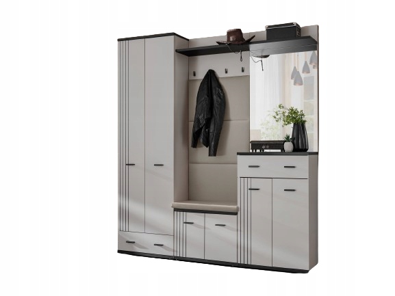 Komoda 60 x 96 x 32 cm, veidrodis 60 x 106.5 x 26 cm, batų lentyna 60 x 46 x 32 cm, sieninis pakabinamas elementas 60 x 157 x 28 cm, spintelė 60 x 203 x 32 cm