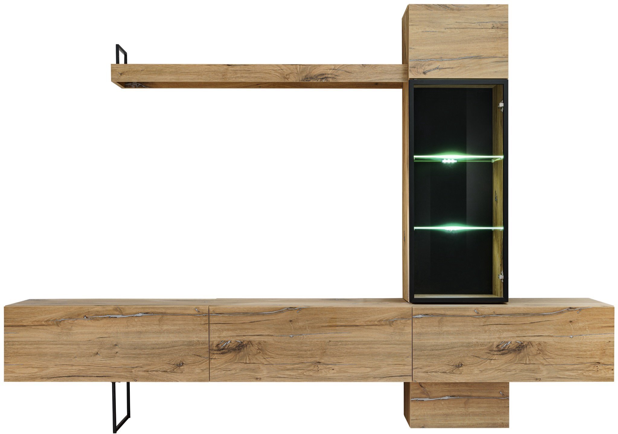 Pakabinamas lentynas su dekoratyviniu metaliniu elementu. Sieninė spintelė su dalinai stiklinta priekine dalimi - juoda aliuminio rėmas. Už durų yra viena įprasta lentyna ir dvi stiklinės lentynos, apšviestos balta LED šviesa. Po TV stovu yra spintelė su sklende. Viduje yra viena erdvė.
