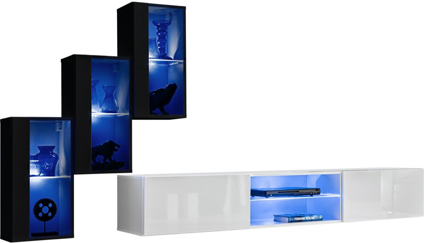 Pakabinamas TV stovas: stiklinė lentyna su mėlyna LED šviesa viduryje, dvi sklendės su stūmimo-spustelėjimo atidarymo sistema, paremtos hidrauliniais siurbliais, už kiekvienos kameros. Priekiniai elementai su stūmimo-spustelėjimo atidarymo sistema.
