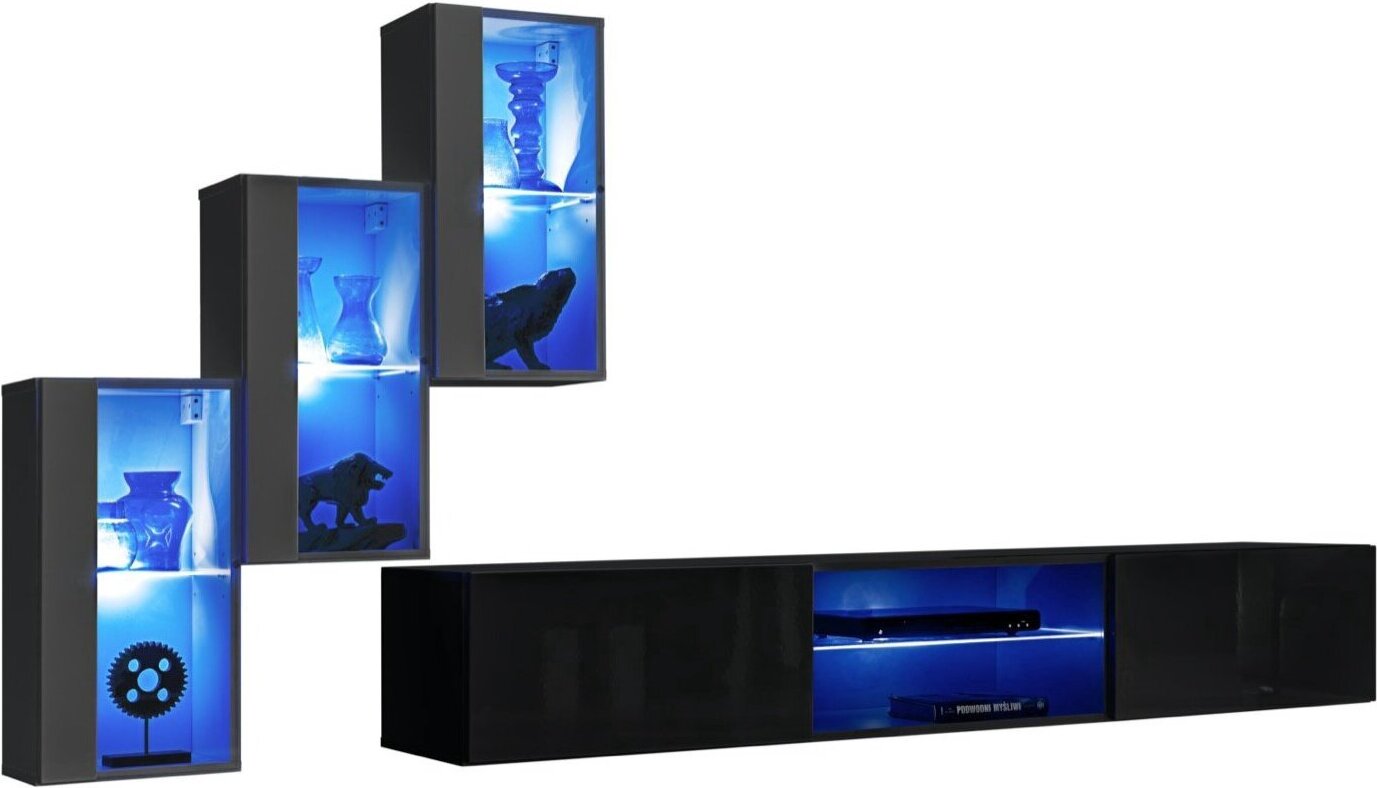 3x Kabinetes su lentyna: dalinai stiklinės durys, už jos viena stiklinė lentyna, su mėlyna LED apšvietimu. TV spintelė: centre yra kamera su stiklinė lentyna, apšviesta mėlynais LED, šonuose yra dujinės durys, už jų yra viena kamera. Atidaromos fasadai spustelėjus pelės mygtuką.
