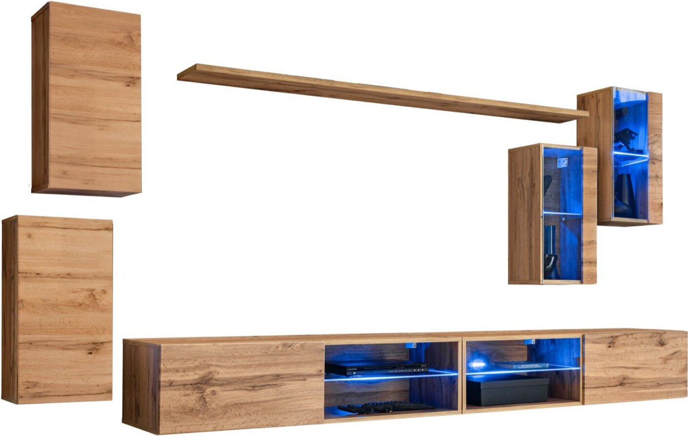 2 sieninės spintos: 30 x 60 x 25 cm; Lentyna: 180 x 1,8 x 20 cm; 2 vitrinos: 30 x 60 x 25 cm; 2x TV spintelė: 120 x 30 x 40 cm. Su mėlyna LED šviesa. Push-click atidarymo sistema paspaudus.