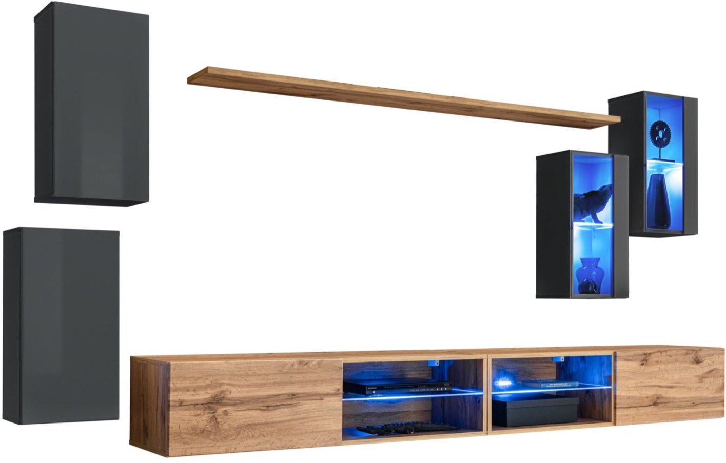 2 sieninės spintos: 30 x 60 x 25 cm; Lentyna: 180 x 1,8 x 20 cm; 2 vitrinos: 30 x 60 x 25 cm; 2x TV spintelė: 120 x 30 x 40 cm. Su mėlyna LED šviesa. Push-click atidarymo sistema paspaudus.