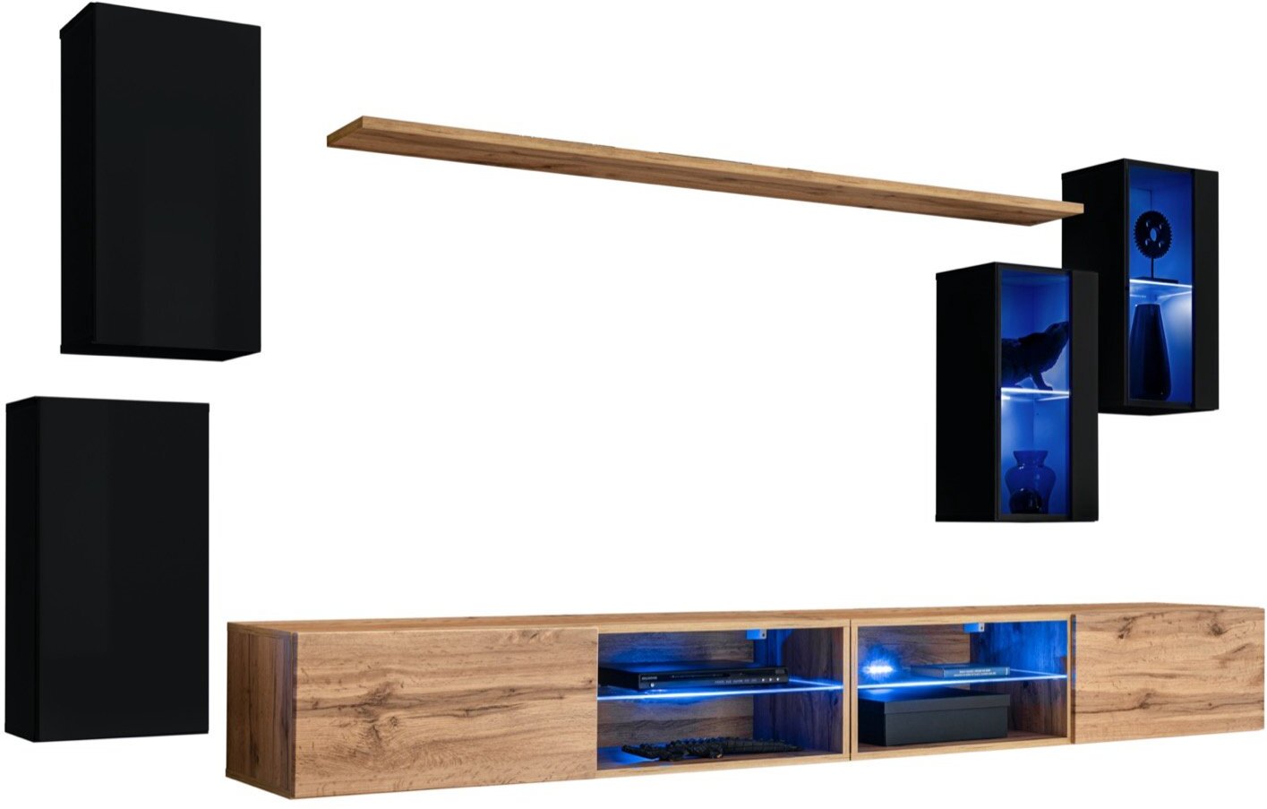 2 sieninės spintos: 30 x 60 x 25 cm; Lentyna: 180 x 1,8 x 20 cm; 2 vitrinos: 30 x 60 x 25 cm; 2x TV spintelė: 120 x 30 x 40 cm. Su mėlyna LED šviesa. Push-click atidarymo sistema paspaudus.