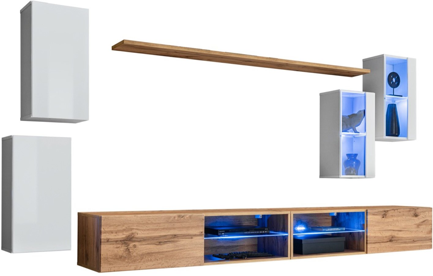 2 sieninės spintos: 30 x 60 x 25 cm; Lentyna: 180 x 1,8 x 20 cm; 2 vitrinos: 30 x 60 x 25 cm; 2x TV spintelė: 120 x 30 x 40 cm. Su mėlyna LED šviesa. Push-click atidarymo sistema paspaudus.