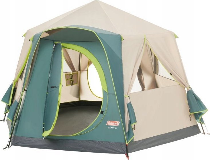 Daugiakampio šonines sieneles galima susukti, kad atsirastų pilnas 360° vaizdas į jūsų apylinkes, o patogumui įrengtos išradingos durys su vyriais. Atidarius šonus, į palapinę patenka daug oro ir šviesos. Yra 2 durys, vienos iš jų - patentuotos „Coleman“ durys su vyriais, o patogumui įrengtas elektros lizdas. Viršutinį sluoksnį galima nuimti ir palapinę paversti nuo vabzdžių apsaugota pavėsine, kuri puikiai tiks sodui. Talpa (asmenų): 6 asmenys. Matmenys: 3,3 x 3,2 x 1,9 m. Palapinės forma: Kupolas. Zonos: Miegojimo. Miegamosios vietos: 1. Miegamosios vietos plotis: 180 cm. Miegamosios vietos dydis: 15,7 m². Sandėliavimo vieta: Nėra. Palapinės tipas: Su rėmu. Vidinė medžiaga: Laidus orui poliesteris, „No-see-um“ tinklelis. Įėjimo tipas: Standartinis įėjimas. Durų tipas: Durys su vyriais. Stovėjimo aukštis (taip/ne): taip. Pastatymo įgūdžiai: Lengva. Galvos aukštis: 160 cm. Veiklos tipas/Naudojimo tipas: Savaitgalio stovyklavimas, atostogų stovyklavimas. popisENG Tipas: Plienas. Siūlės: Klijuotos. Pagrindo medžiaga: PE, suvirintas. Visiškai integruotas pagrindas: Taip. Išorinė medžiaga: Poliesteris, padengtas PU. Pastatytos palapinės dydis (m2): 11,6 m². Vandens stulpelis (mm): 2000 mm. Langai (skaičius): 5. Apsauga nuo UV spindulių: Taip. Atsparumas vandeniui: Taip. Atsparumas ugniai: Taip. Virvės: Standartinės. Pakuotės dydis: 72 x 28 x 28 cm. Svoris (kg): 14,5 kg. Į komplektą įeina nešiojimo krepšys: Taip. Nešiojimo krepšio medžiaga: 100 % poliesteris