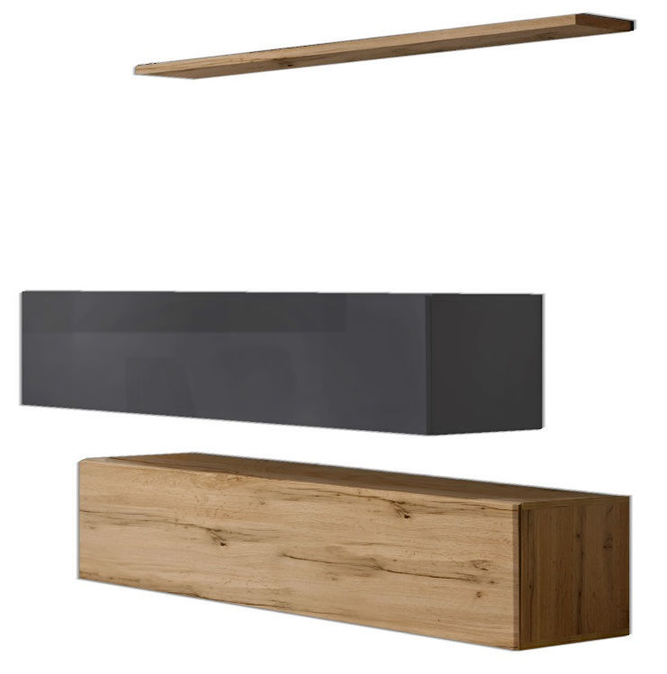 Atidarymo sistema Push-Click. Ilgos lentynos dydis: 120 x 2.2 x 20 cm Komplekte yra tik 2 sieninės spintelės ir sieninė lentyna, kiti interjero dizaino daiktai neparduodami.