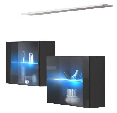 Push-Click atidarymo sistema. Mėlynas LED apšvietimas. Ilgosios lentynos matmenys: 120 x 2,2 x 20 cm. Komplekte yra tik 2 sieninės spintelės ir sieninė lentyna, kiti nuotraukoje matomi interjero daiktai neįtraukti.