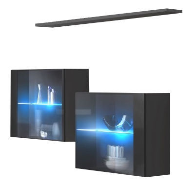 Push-Click atidarymo sistema. Mėlynas LED apšvietimas. Ilgosios lentynos matmenys: 120 x 2,2 x 20 cm. Komplekte yra tik 2 sieninės spintelės ir sieninė lentyna, kiti nuotraukoje matomi interjero daiktai neįtraukti.
