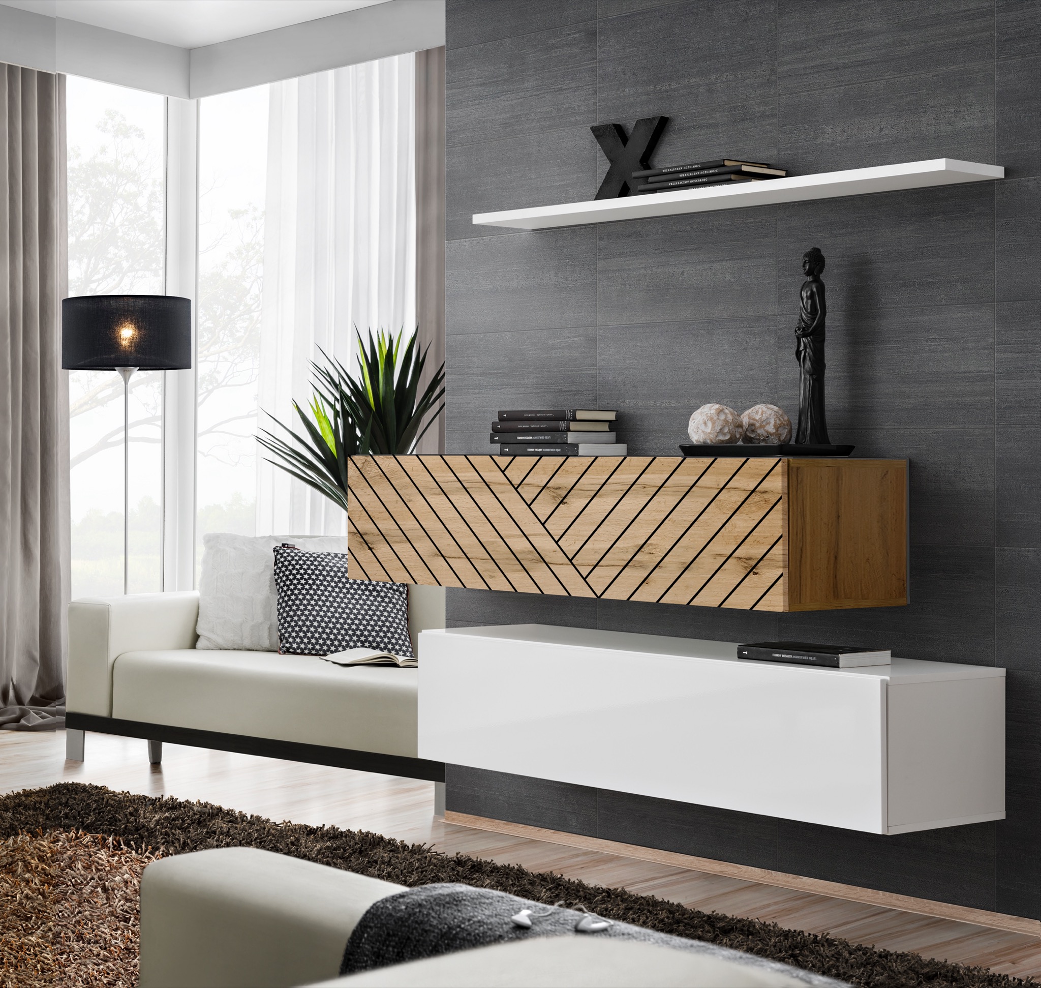 2 x pakabinamos spintelės: 130 x 30 x 110 cm, 120 x 40 x 30 cm, 1 x sieninė lentyna 120 x 20 x 1,8 cm