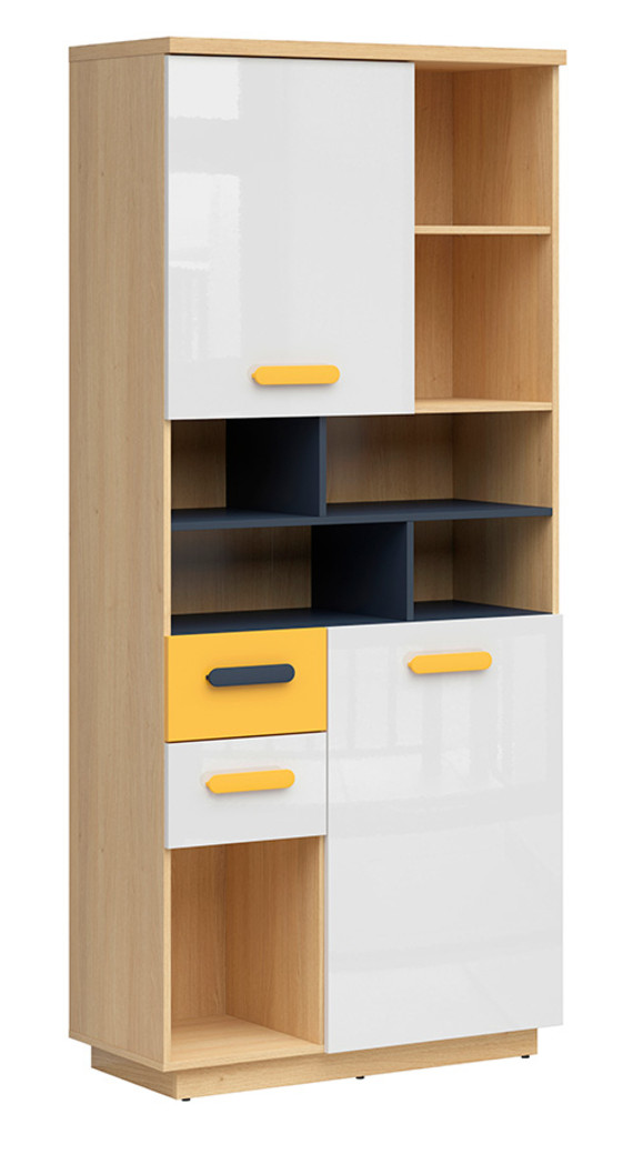 Plačios knygų lentynos privalumas yra jos spalvų schema. Blizgančios baltos spalvos ir geltonos spalvos priekiai sujungti su lenkiško ąžuolo korpusu ir tamsiai mėlynos spalvos lentynomis. Ovališkos rankenos tamsiai mėlynos ir geltonos spalvos buvo pasirinktos kontrastingumo principu, taip pabrėžiant laisvą, jaunatvišką stilių.
