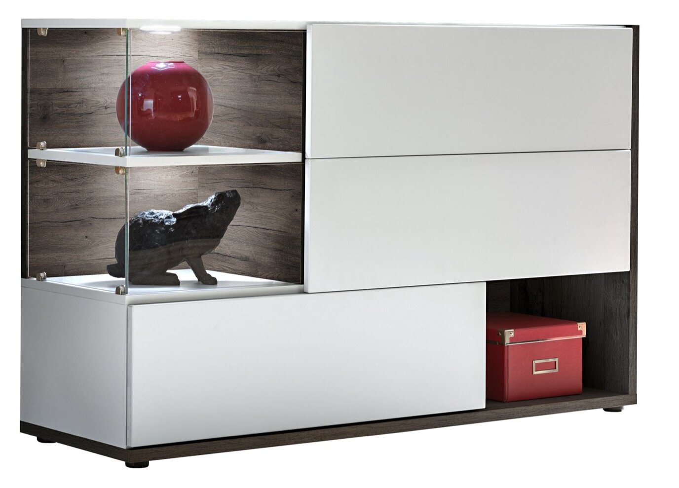 Dvi dalys su stiklo intarpais (viršuje ir viduryje) su spragtelėjimo atidarymo sistema, laikomos ant vyrių. Už pilnos dalies yra vienas skyrius, už stiklinės dalies yra vienas skyrius ir iš dalies stiklinė korpuso lenta. Apačioje yra durelės su vienu skyriumi už jų ir atviras skyrius dešinėje.
