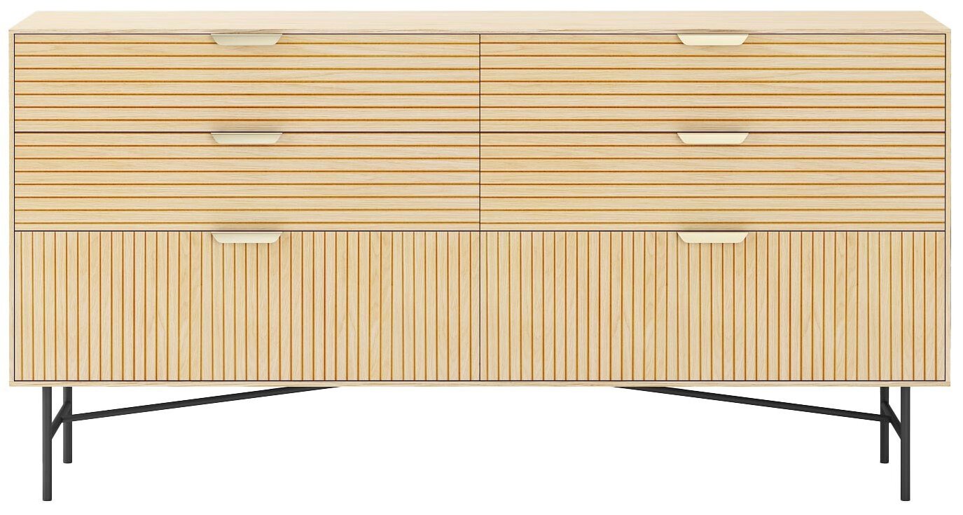 Šoninė spintelė pagaminta iš melamino plokštės su šviesios medienos dekoru. Šoninė spintelė atrodo stilingai dėl briaunotos durelių plokščių ir auksinių rankenų. Metalinės kojos ir rėmas apdengti juoda milteline danga.