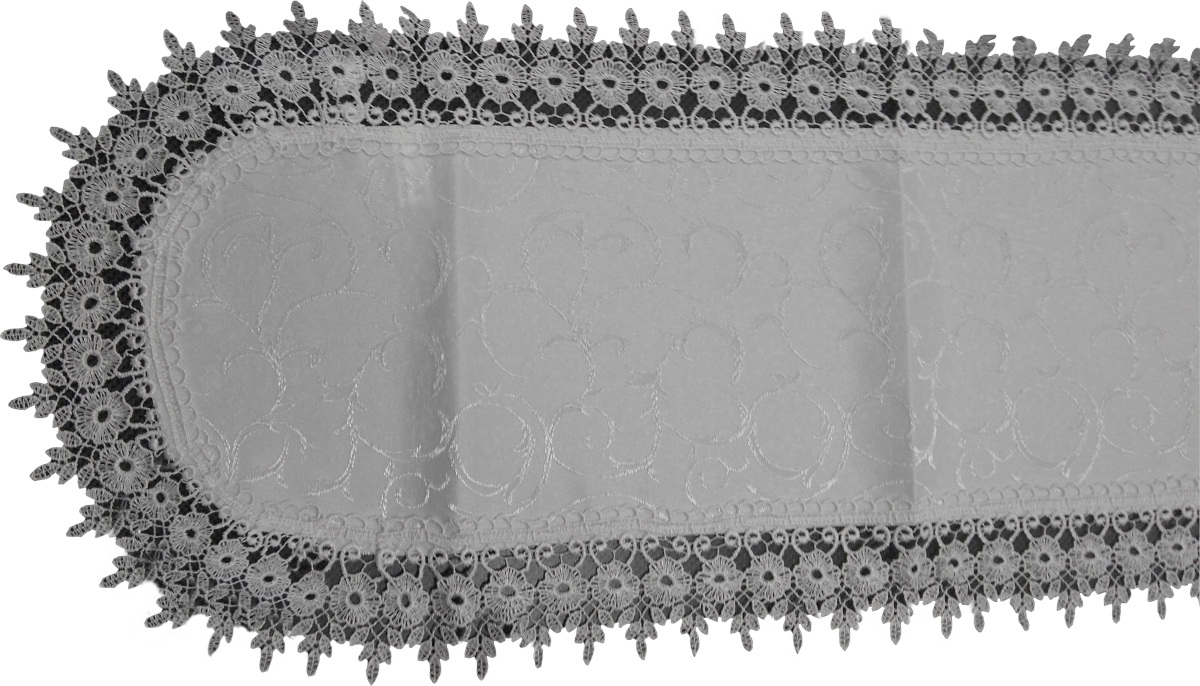 Stalo bėgikas pagamintas iš dėmių atsparaus audinio, apkarpyto ir dekoruoto gipiūru. Jis pasižymi anti-dėmių savybėmis, todėl yra labai praktiškas ir lengvas naudoti. Primename, kad kompiuteriai spalvas rodo pagal individualius nustatymus ir ypatybes. Matmenų tolerancija: +/-5%. Priežiūros instrukcijos: skalbiamas (išsami informacija ant etiketės).