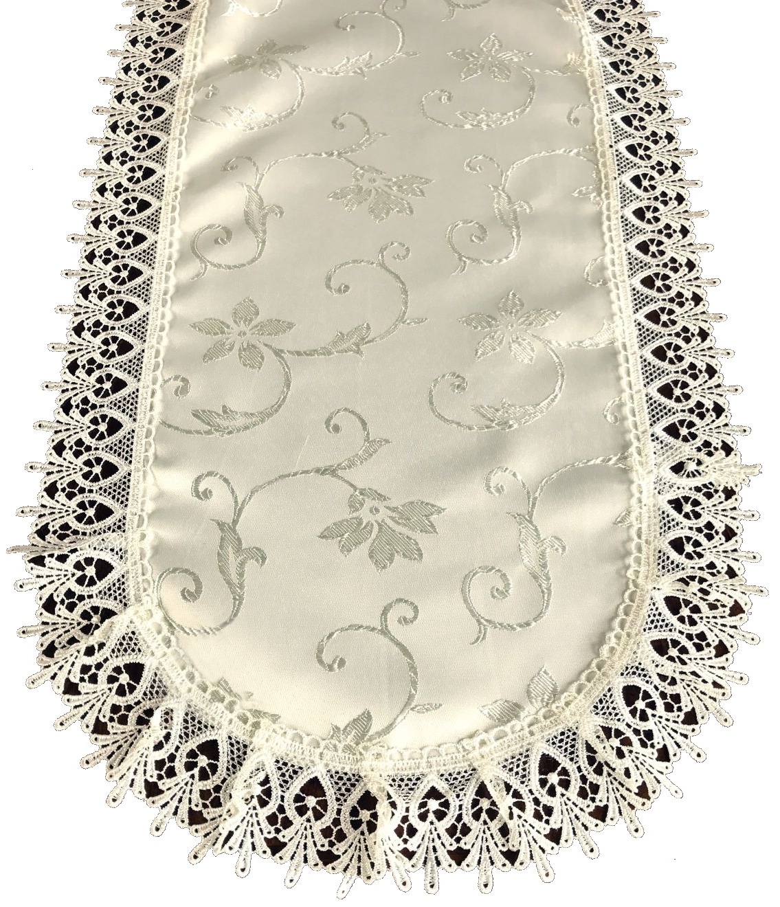 Stalo bėgikas pagamintas iš dėmėms atsparaus audinio, apkarpyto ir dekoruoto gipiūru, 20 cm pločio. Jis pasižymi anti-dėmių savybėmis, todėl yra labai praktiškas ir lengvai naudojamas. Primename, kad kompiuterio ekranas spalvas rodo atsižvelgiant į individualius nustatymus ir savybes. Matmenų tolerancija: +/-5%.