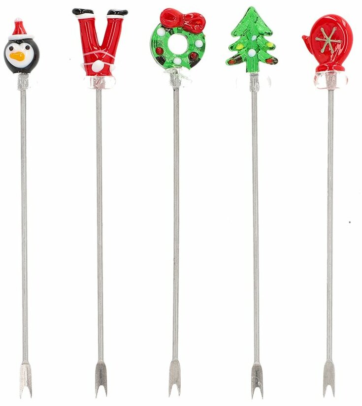 10 cm ilgio lazdelės yra su dviem dantytomis viršūnėmis, todėl galite lengvai paimti smulkius užkandžius – sūrio gabalėlius, alyvuoges. Lazdelių viršus papuoštas dekoratyvinėmis miniatiūromis šventine tematika, kurios taip pat atlieka patogias rankenėles. Rinkinį sudaro 5 lazdelės.