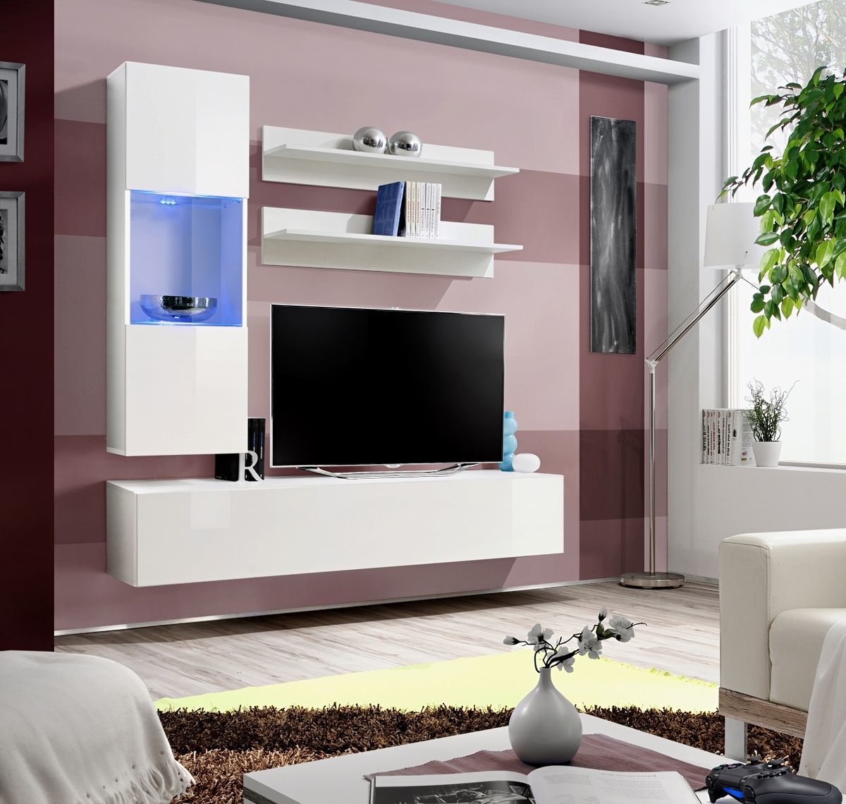 Atidarymo sistema Push-Click. TV staliukas su 3 skyriais. Durys gali būti montuojamos iš abiejų pusių. Stiklinės lentynėlės su LED apšvietimu. Nuotraukoje matomi papildomi daiktai komplekte neparduodami