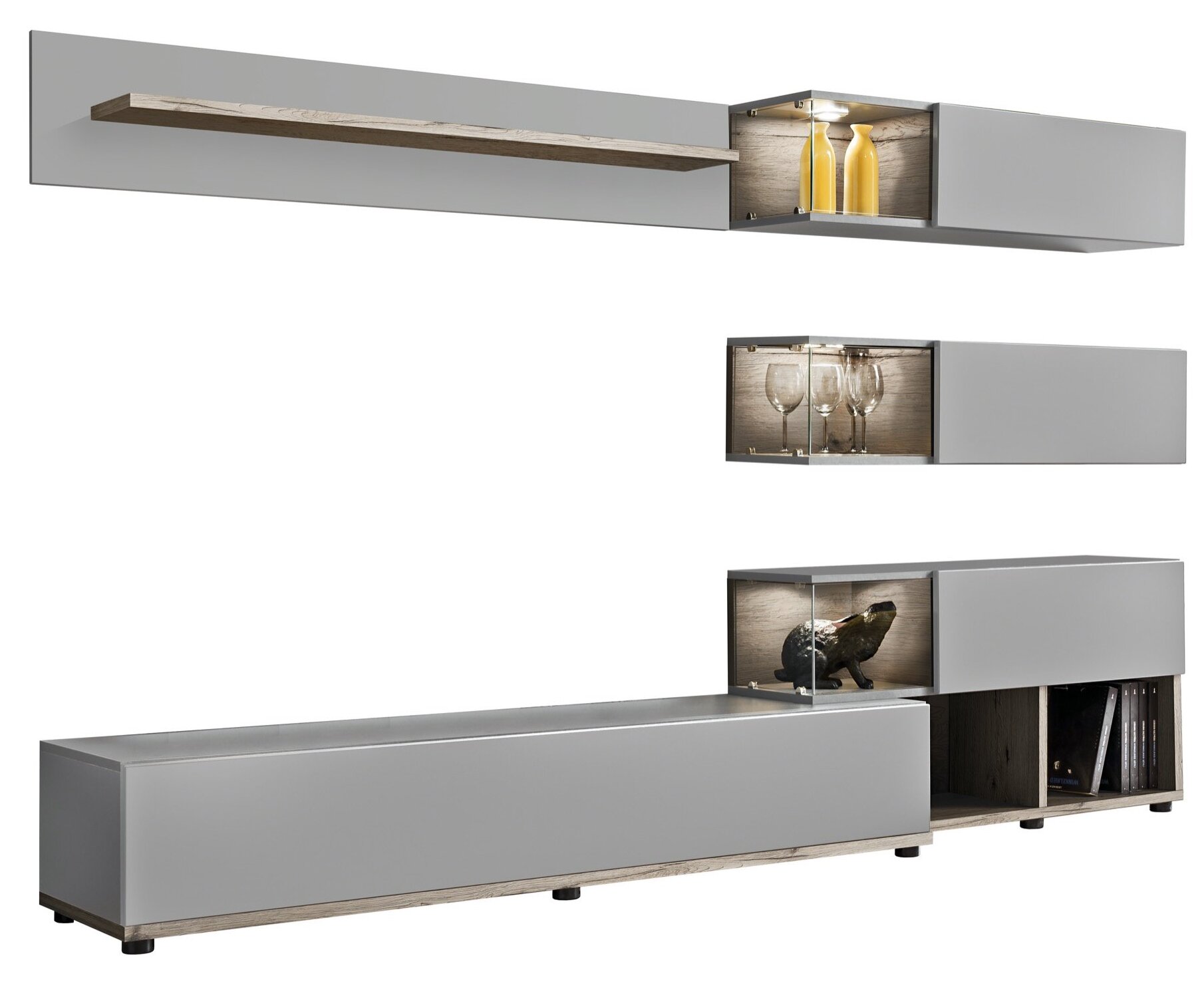 TV stovas: 1 durelė, už jos yra 3 skyriai. Apatinė spintelė: 2 atviros vietos. 3x kabinamos spintelės. Durelės iš dalies stiklinės. Už kiekvienos durelės yra 2 skyriai. Balta kvadratinė LED apšvietimas. Visos priekinės dalys atsidaro paspaudus - spustelėjus.