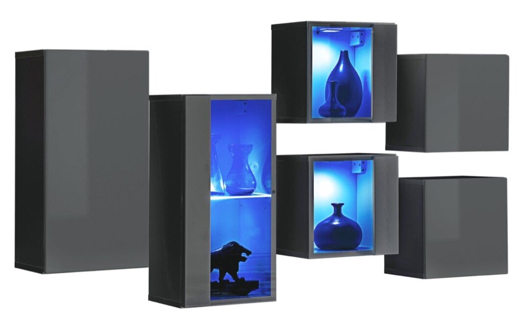 Pakabinamos spintelės matmenys SW4: 30x60x25cm; Pakabinamos vitrinos matmenys WW4: 30x60x25cm; Pakabinamos vitrinos matmenys WW5 (x2): 30x30x25cm; Pakabinamos spintelės matmenys SW5 (x2): 30x30x25cm