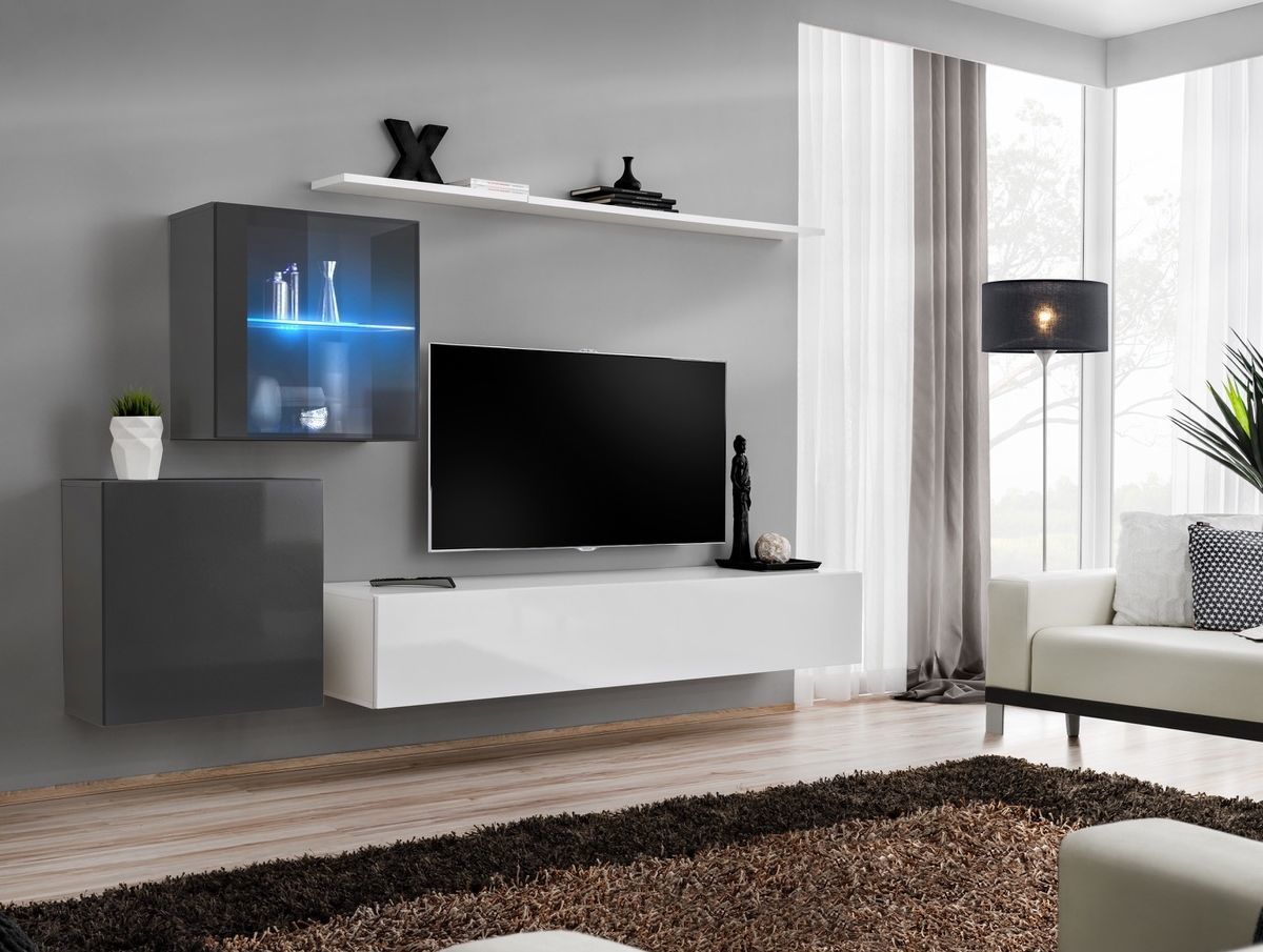 TV sieninė spintelė: Įrengta atlenkiama durelė, atidaroma paspaudus (push-click) mechanizmu. Viduje yra trys skyriai medijos įrenginiams ir priedams susidėti. Lentyna įtraukta į komplektą.