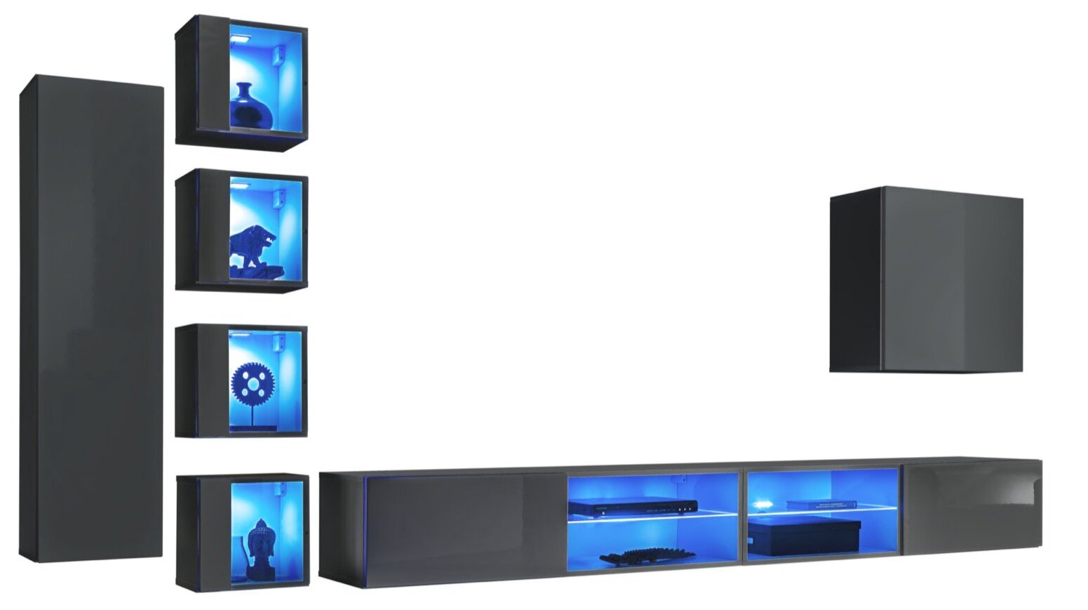 Ilgas kabinetas su pakabinimu: dvi lentynos už nugaros (trys skyriai). 4x pakabinamas kvadratinis kabinetas: durys iš dalies stiklinės, už kameros su mėlyna LED šviesa. Didelis pakabinamas kvadratinis kabinetas: viena lentyna (du skyriai). 2x pakabinamas televizoriaus stovas: kamera su stiklinėmis lentynomis ir mėlyna LED šviesa, ant hidraulinių pompų pritvirtintas dangtis. Priekiai su push-click atidarymo sistema.