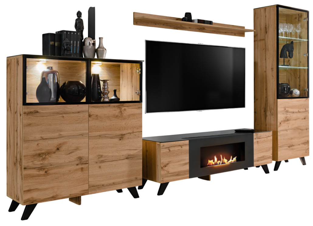 Šis baldų komplektas pasižymi darniu dizainu su juodomis kojelėmis ir pasikartojančiu dėmesiu saugojimo sprendimams, stiklui ir integruotam apšvietimui. Komplektą sudaro: